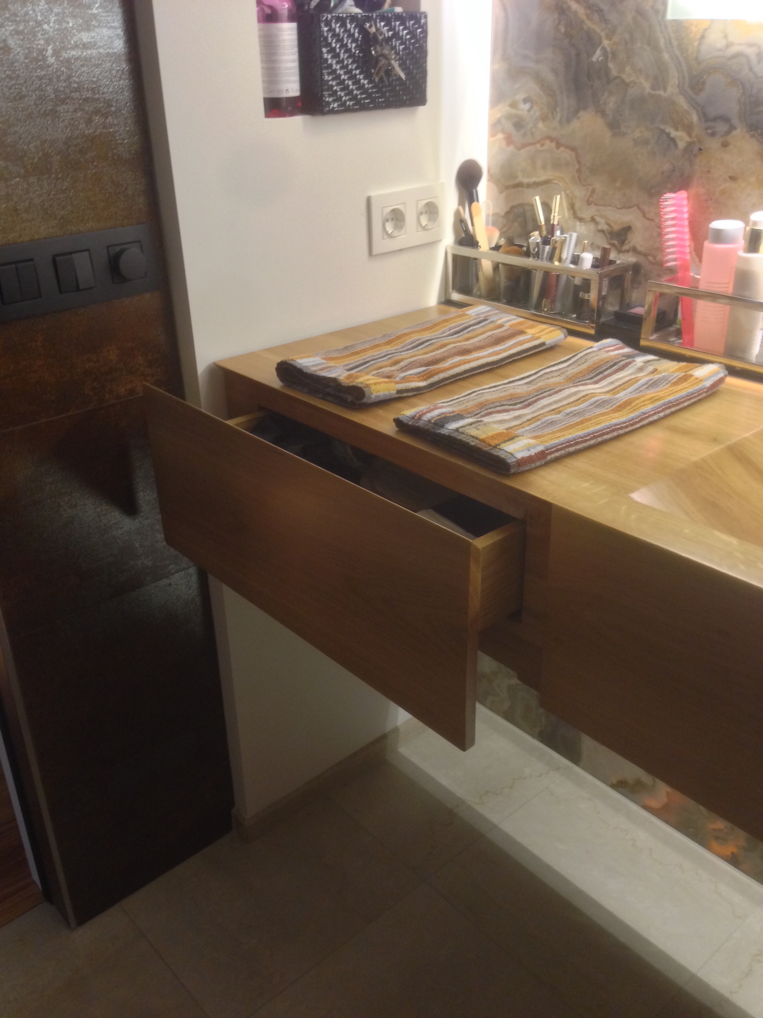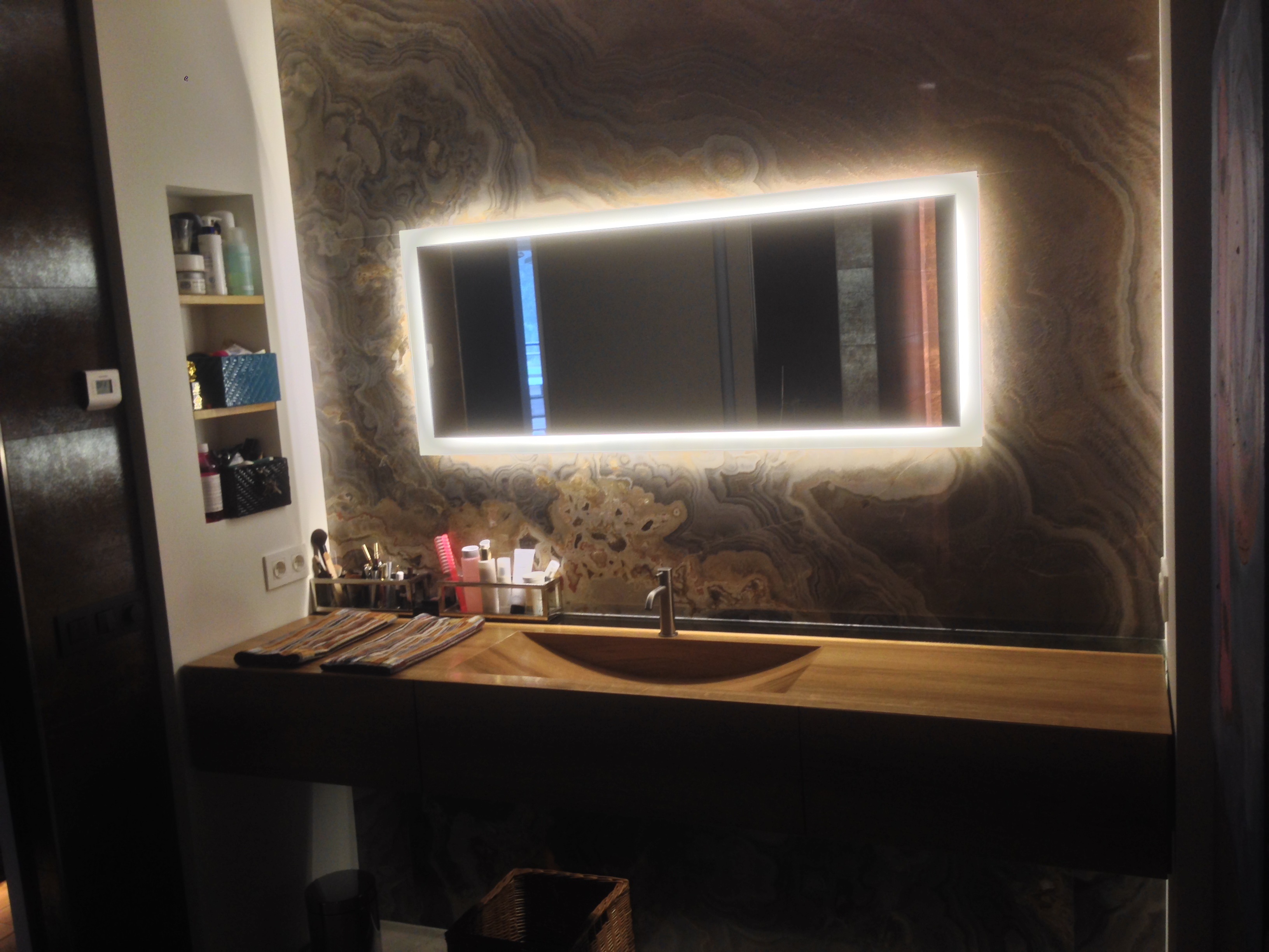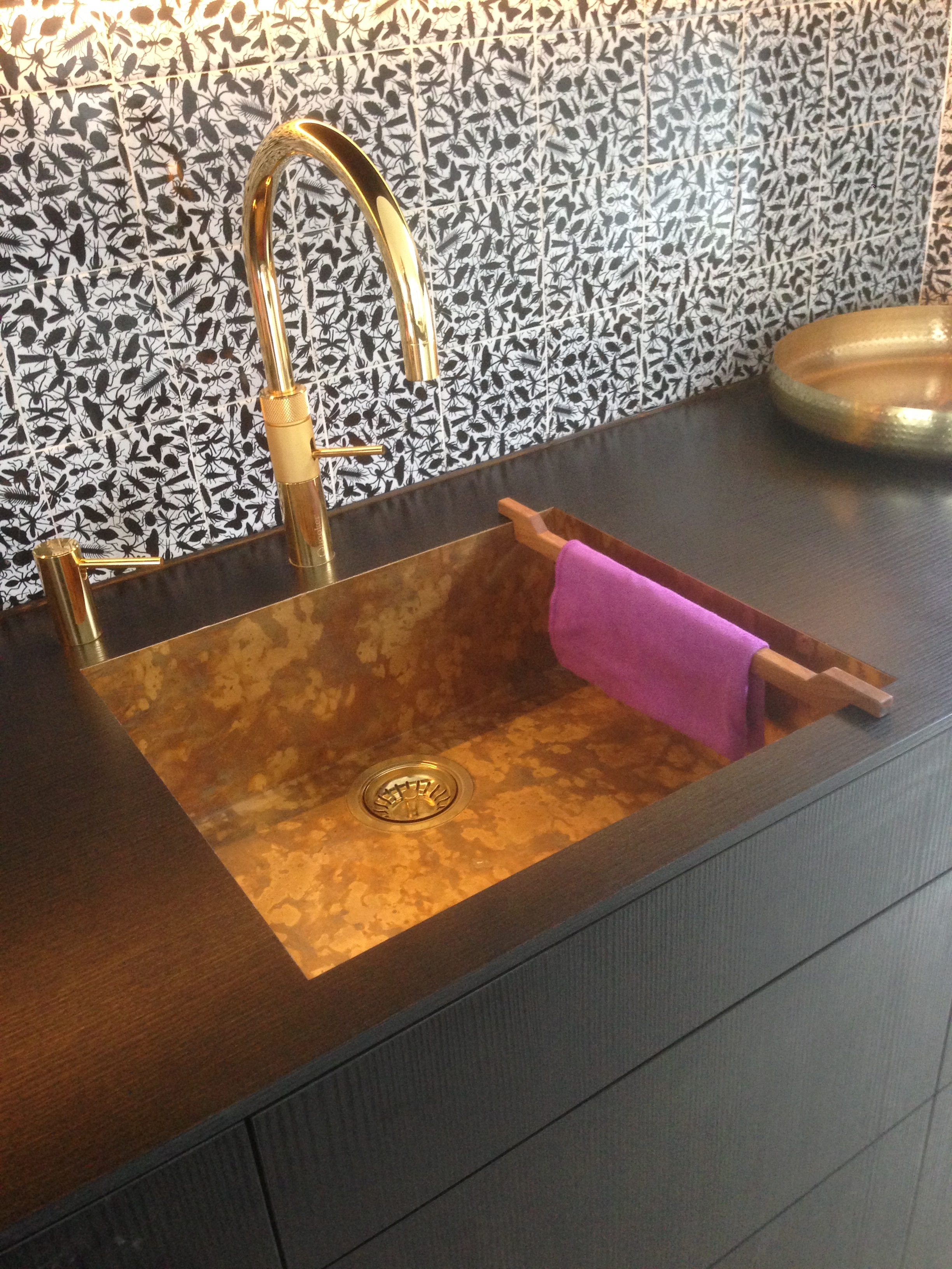 De keuken is ‘one of a kind’. Met een betonnen kookeiland, een gouden Quooker en wasbak, en goudtinten als wand- en kastbekleding, heeft de keuken een luxe en warme uitstraling. Voor de badkamer hebben we naast de houten wasbak met laden, ook de bijzondere achterwand ontworpen. De glazen achterwand met natuursteen en verlichting is een kunstwerk op zich.